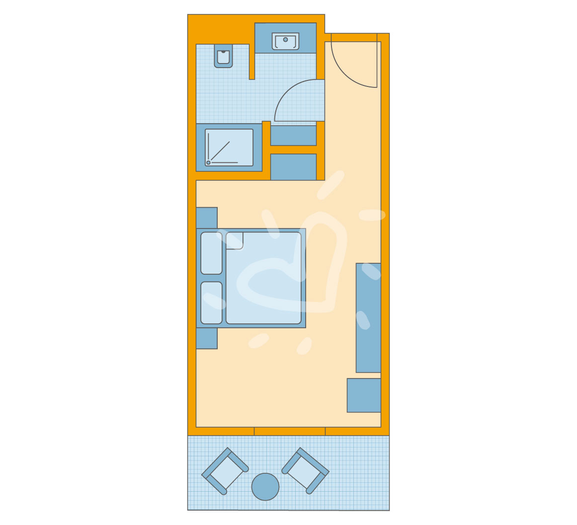 Details anzeigenKombinierter Wohn-/Schlafraum, separates Schlafzimmer, für 2 Erwachsene und 1 Kind, Bad mit Dusche und WC, Balkon, ca. 39 m². Unterbringung 3. Person auf der Schlafcouch ca. 160 x 195 cm.