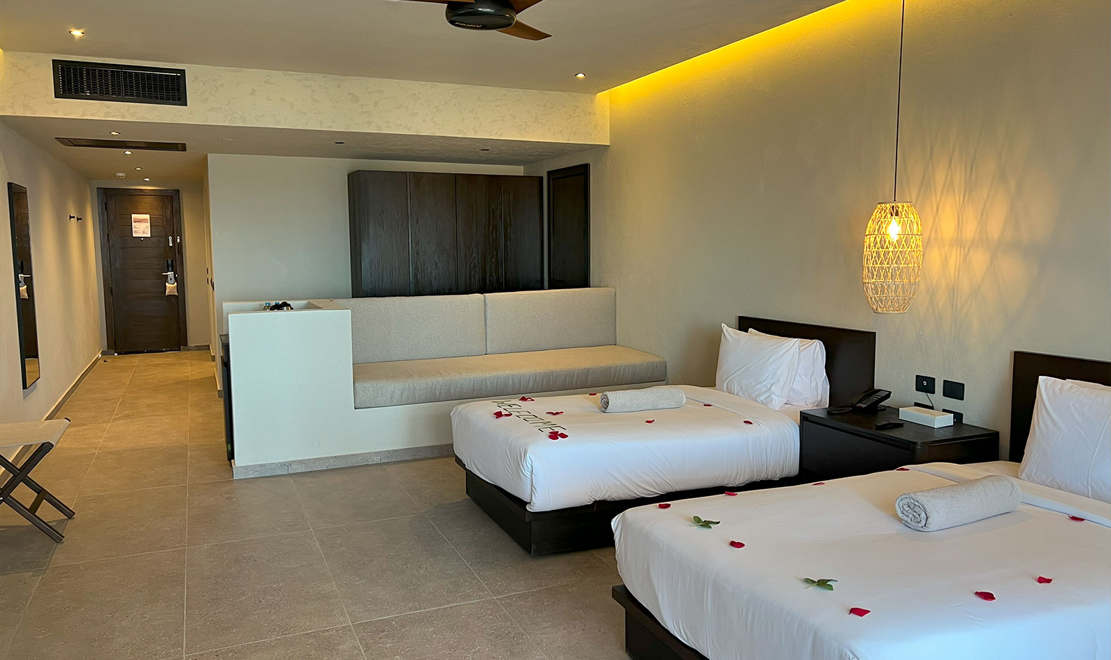 Details anzeigenSuite mit direktem Poolzugang über eigene Terrasse, Bad mit Badewanne und Dusche, ca. 59 m². Zusatzbett/Sitz-Schlafsofa: ca.100 x 200 cm.
