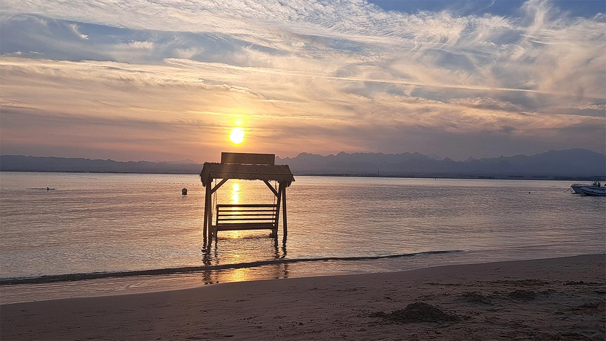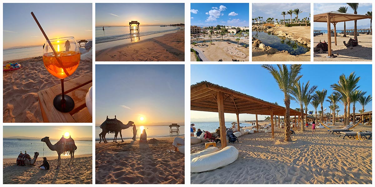 Unser ganz persönliches Highlight: der Sonnenuntergang direkt am Sandstrand im Robinson Club Soma Bay. In gemütlichen Sitzsäcken, mit einem kühlen Getränk in der Hand und den Füßen im warmen Sand, erlebten wir einen Moment, der in Erinnerung bleibt. Während die Kamele gemächlich vorbeischlenderten und im Hintergrund Live-Musik erklang, war die Atmosphäre einfach einzigartig – ruhig, schön und zutiefst beeindruckend.