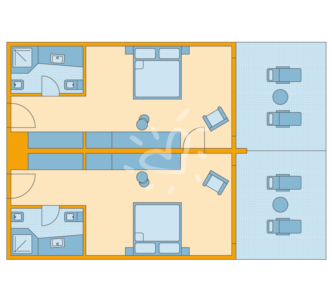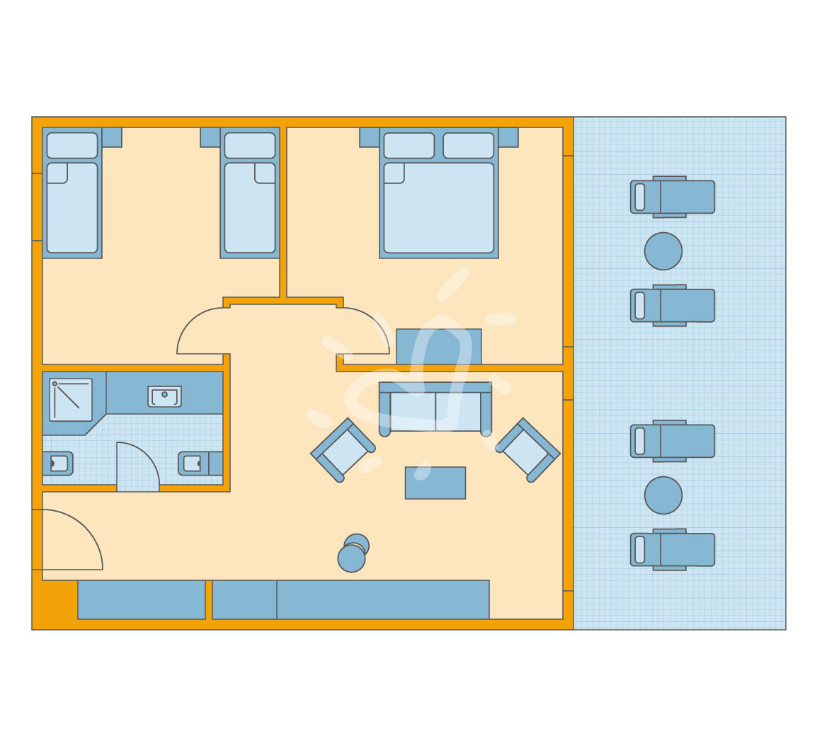 Details anzeigenNichtraucherzimmer, ca. 46 m² Gesamtanzahl der Räume in diesem Zimmertyp: 3, Aufteilung wie folgt: Wohnzimmer, 2 Schlafzimmer 1 Doppelbett (200x200cm, bestehend aus 2 zusammenstehenden Einzelbetten), 2 Einzelbetten (90x190cm; nicht zusammenschiebbar), 1 Schlafsofa (160x200cm), Babybett: ohne Gebühr Personenbelegung / Hinweise (FZX1): Mindest-/Maximalbelegung: mind. 2 Erwachsene und 1 Kind ab 2 Jahren / max. 4 Erwachsene, 1 Kind/Jugendlicher von 2-17 Jahre und 1 Kleinkind unter 2 Jahren Die Unterbringung der 5. Person erfolgt auf dem Schlafsofa