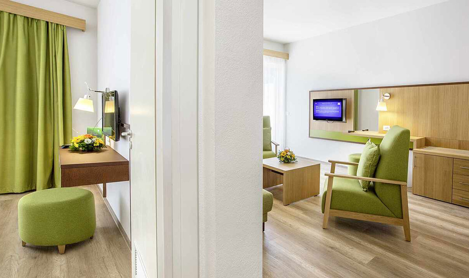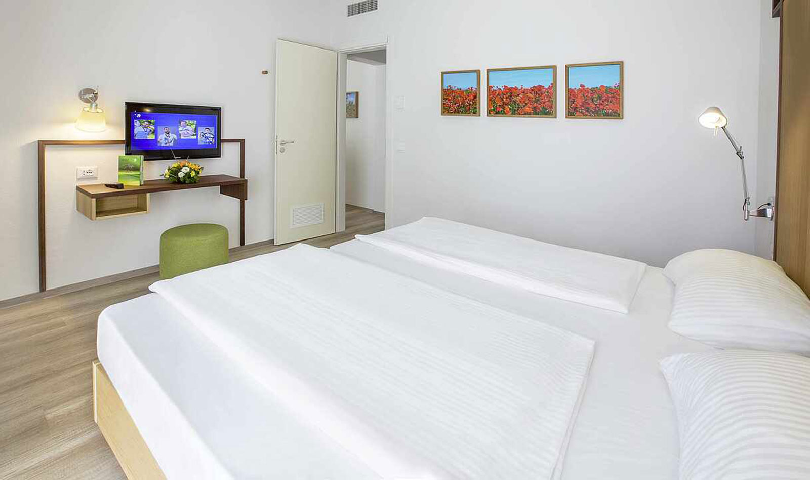 Details anzeigenNichtraucherzimmer im Erdgeschoss gelegen ca. 66 m² Gesamtanzahl der Räume in diesem Zimmertyp: 2, Aufteilung wie folgt: bestehend aus 2 Doppelzimmern mit Verbindungstür 2 Doppelbetten (200x200cm), Babybett: ohne Gebühr Mindest-/Maximalbelegung: mind. 2 Erwachsene und 2 Kinder ab 2 Jahren / max. 4 Erwachsene, 2 Kinder/Jugendlicher von 2-17 Jahre und 1 Kleinkind unter 2 Jahren die Unterbringung der 5. und 6. Person erfolgt auf dem Schlafsofa Besonders für Familien mit älteren Kindern geeignet